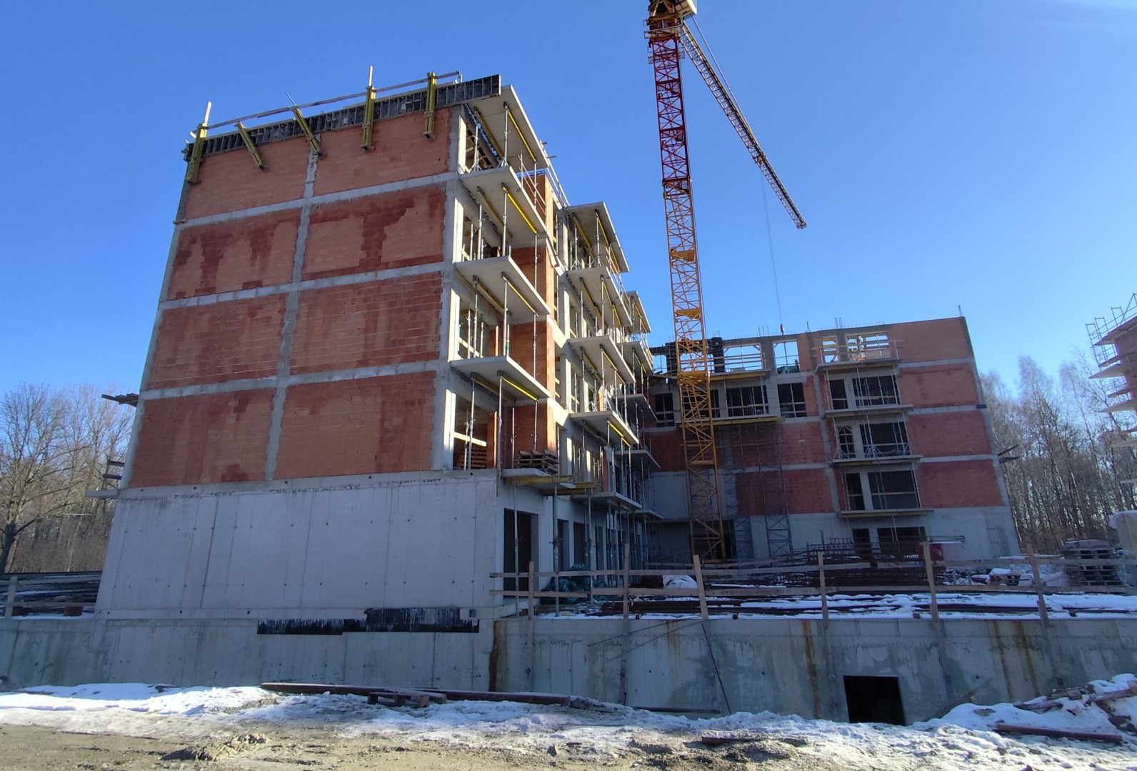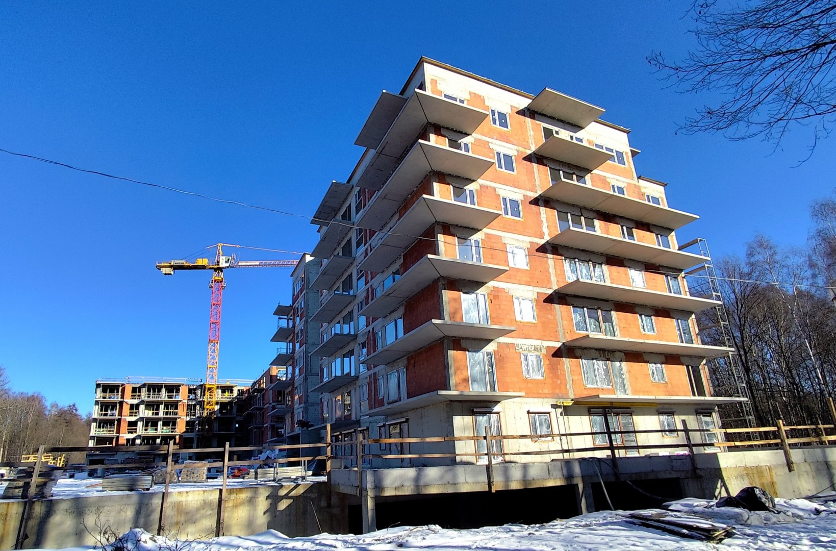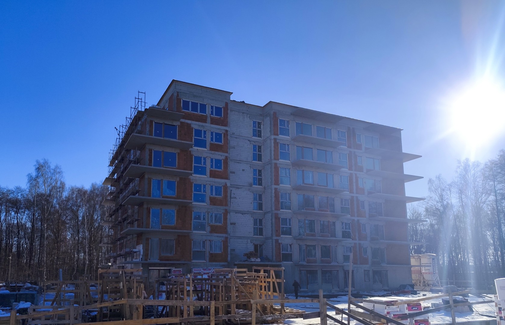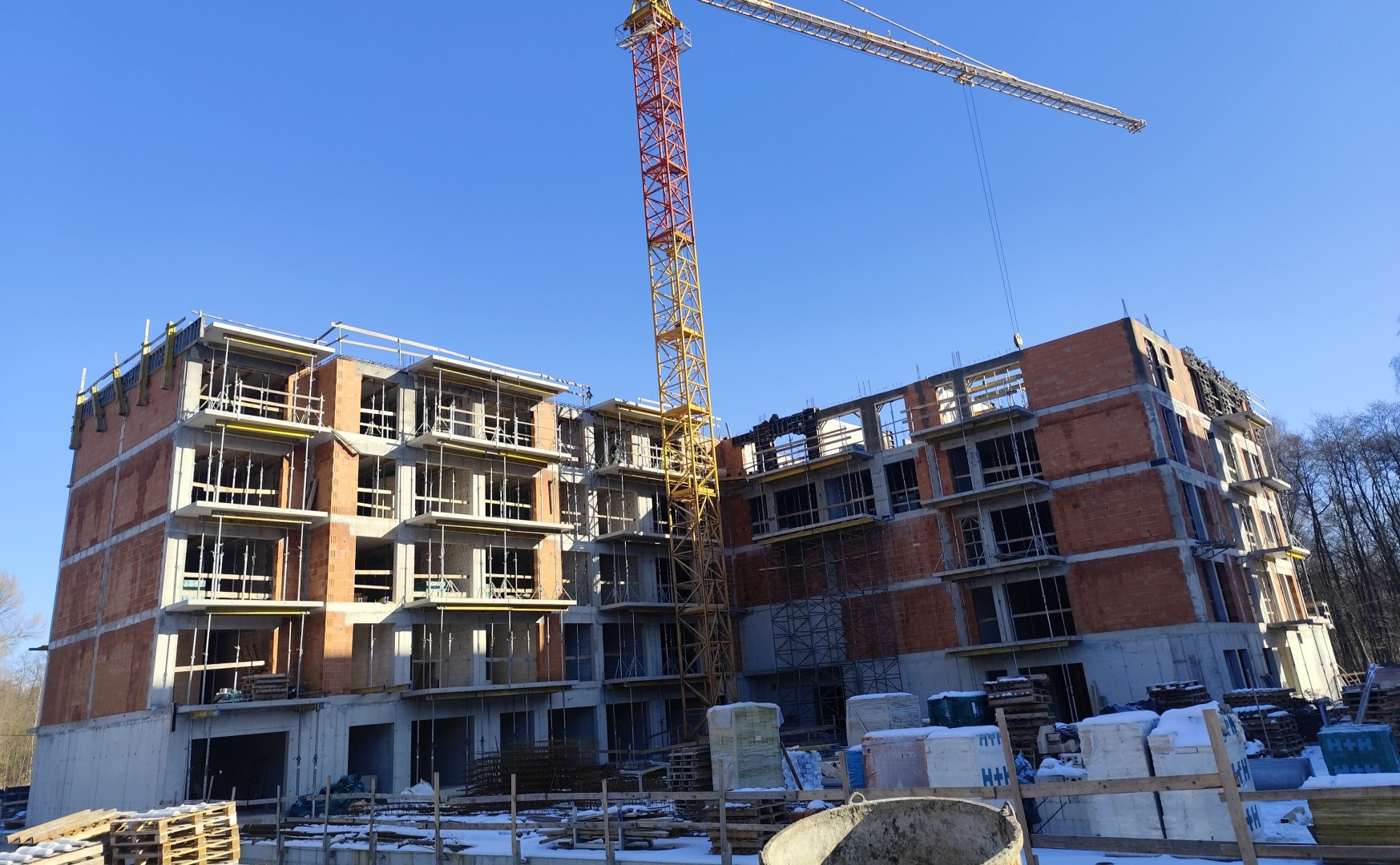 Budynek A zosta艂 ju偶 zamkni臋ty od g贸ry dachem. W otwory okienne pomontowane zosta艂y ju偶 wszystkie okna oraz drzwi tarasowe. Budynek zosta艂 ju偶 wyposa偶ony do ko艅ca w piony wentylacyjne oraz kanalizacyjne, kt贸re to zosta艂y wyprowadzone nad dach. Zdemontowali艣my 偶uraw, co potwierdza zako艅czenie "ci臋偶kich" prac budowlanych. Dzi臋ki pot臋偶nej dawce ciep艂a, kt贸re wytwarzaj膮 nasze nagrzewnice mo偶emy w warunkach zimowych kontynuowa膰 prace tynkarskie, kt贸re obecnie trwaj膮 na 4 oraz 3 pi臋trze. Budynek zosta艂 obudowany rusztowaniem z dw贸ch stron co ci膮gnie za sob膮 rozpocz臋cie prac elewacyjnych.
